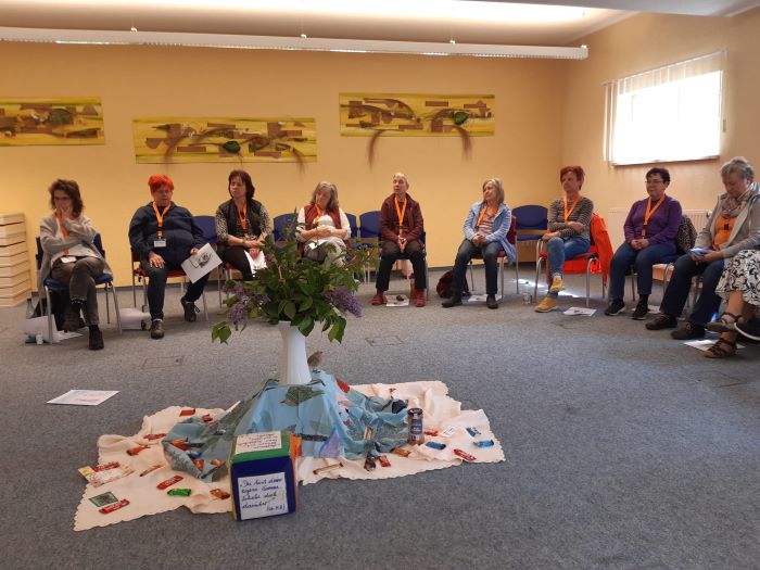 Der Freitagabend startete mit einer Begrüßungsrunde. Dazu suchten sich alle Frauen einen Gegenstand, aus der vorbereiteten Mitte, aus und erzählten, was dieser mit ihnen zu tun hat. So kamen wir gut ins Gespräch. Auch über die Erwartungen an das Wochenende tauschten wir uns noch aus. | ![]() |