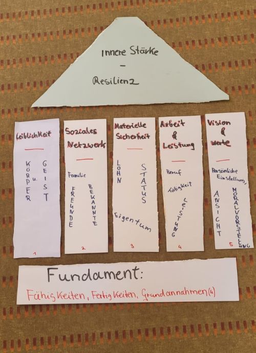 Am Samstagmorgen wurde der Film ausgewertet und eifrig diskutiert. Danach ging es zum eigentlichen Thema. „Selbstachtsamkeit und Selbstwert“, was verbirgt sich eigentlich dahinter? Um gut auf sich achten zu können, ist es wichtig, stabil im Leben zu stehen und Zusammenhänge zu erkennen. Jeder Mensch ist anders und entwickelt im Laufe seiner Kindheit und Jugend seine eigene Persönlichkeit: Wer bin ich, worüber definiere ich mich, wo gehöre ich hin, was macht mich aus? Die Identität, welche die Einzigartigkeit des Menschen ausmacht, entwickelt sich ständig. Der Psychologe Hilarion Petzold beschreibt die Identität in 5 Säulen. Dieses Model konnte wunderbar dafür genutzt werden, um aufzuzeigen, was im Leben wichtig ist und warum das Leben manchmal ins Wanken gerät.
