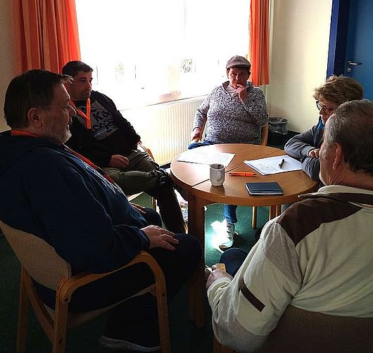 Nach der Mittagpause teilten wir unsere Teilnehmer in 4 Kleingruppen auf, worauf diese sich in verschiedene Räumlichkeiten verteilten und über das Seminarthema fachsimpelten. Natürlich besprachen sie auch noch andere Themen, wie z.Bsp. Zusammenarbeit/-Halt in den Gruppen, Gruppenarbeit , Freizeitgestaltung in der Gruppe. Der Nachmittag verging wie im Fluge. Wir verabschiedeten alle zum Abendbrot mit dem Hinweis sich 20.00 Uhr im Gemeinschaftsraum wieder einzufinden. Den Abend gestalteten wir mit einem Was/Wer bin ich Spiel, im Anschluss konnte wer wollte ein paar Episoden aus seiner nassen Vergangenheit erzählen. Es war mitunter schon lustig was mancher so angestellt hat, es war kurzweilig zuzuhören. Nachdem langsam die Luft raus war, sind einige aufs Zimmer gegangen und ein paar andere trafen sich zum Kartenspiel.