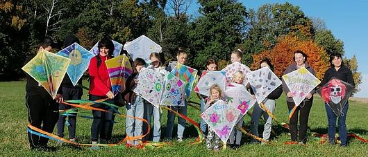 Am Abend wurden Drachen gebastelt. Sie sahen so toll aus, dass der Wind und die Sonne auch begeistert davon waren und am Mittwoch ihr Bestes gaben. Wir sind auf den Windmühlenberg gelaufen. Alle Drachen funktionierten super und haben am Himmel getanzt. Das war ein wunderschönes Bild. Und als Überraschung gab es noch ein Eis. | ![]() |