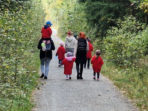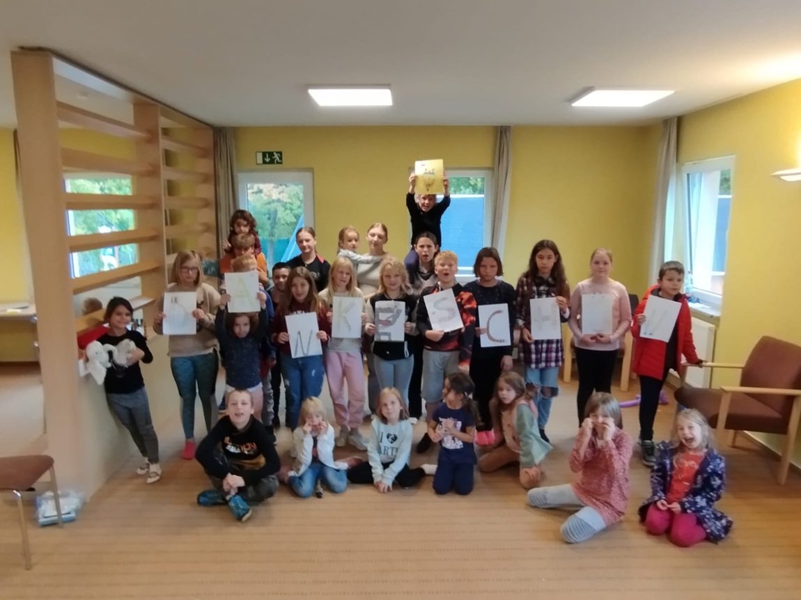 Vor dem Mittagessen gab es eine Begrüßungsrunde. Am Nachmittag startete wir die Schatzsuche. In 3 Gruppen ging es durch den herbstlichen Wald. Dabei war die erste Herausforderung, einen aufgeblasenen Luftballon mit zunehmen und diesen bis ins Ziel zu tragen. An verschiedenen Punkten waren Aufgaben zu erledigen. Das waren zum Beispiel: Dinge ertasten, Scherzfragen lösen, ein lustiges Foto und so viele Kinder wie möglich auf einem Baumstamm unterbringen. Im Zielbereich gab es noch ein Wetthüpfen, in einer extra angefertigten Hose, wo jedes Kind in ein Bein passte. Das war lustig. Im Anschluss durften die Kinder die gut versteckte Schatzkiste suchen. Es dauerte eine Weile bis sie diese gefunden hatten.