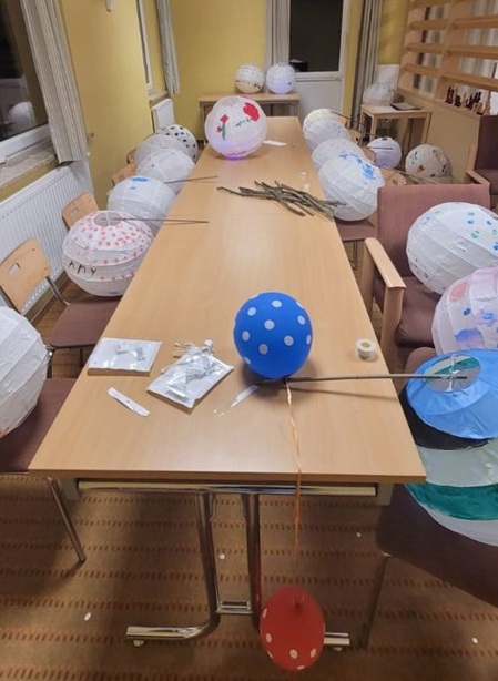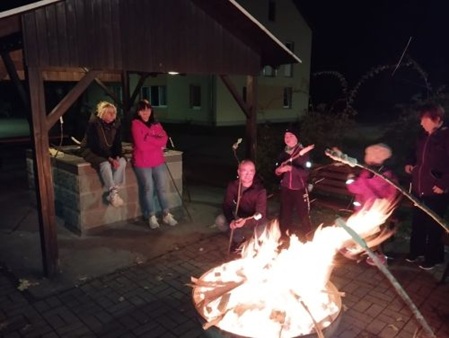 Am Abend ging es dann zur Nachtwanderung. Die Lampenschirme, welche uns IKEA geschenkt hat, waren wunderschön bemalt und dienten jetzt als Lampion. Die bunten LED Blinklichter in den Lampions wechselten die Farbe. Farbenfroh, gut gelaunt und mit ein bisschen ängstlicher Aufregung ging es durch den Wald. Eines der Kinder wurde unbemerkt als Elch verkleidet und begann das Feld von hinten aufzurollen und erschreckte die anderen. Es gab ein kleines Kreischen und Lachen. Danach gab es am Lagerfeuer für alle leckeren Knüppelkuchen.