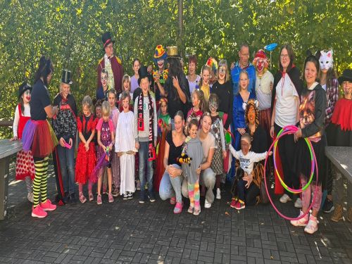 Es war wunderbar zu beobachten, wie alles sich zusammenfügte. Es wurden Aufritte erarbeitet, Kostüme rausgesucht, gelacht, geprobt und auch der Auftrittsraum wurde geschmückt. Am Nachmittag war es soweit. Alle hatten Kostüme an, waren geschminkt und aufgeregt. Die Zirkusvorstellung war super. Es war erstaunlich wie reibungslos die Kinder mit Unterstützung der Erwachsenen ihre Programmnummer vorführten. Alle lachten über die Clowns, bewunderten die Zauberer, staunten über Handstand, Spagat oder darüber, dass ein Junge super einen Hula-Hoop-Reifen um den Bauch tanzen lies. Die Bauchtänzer bewegten beim Tanzen bunte Bänder, die Tiere sprangen durch reifen und als der Fakir dran war, waren alle besonders mutig. Der Fakir hatte echte (unscharf gemachte) Glasscherben dabei. Zuerst liefen seine 2 mutigen Assistentinnen über die Scherben. Dann schlossen sich ganz viele Kinder freiwillig an und bewiesen echt Mut. Der Clown wollte dann mit Schuhen darüber laufen. Das liesen die Kinder nicht zu. So lief auch der Clown über die Scherben. Es gab tosenden Applaus und anschließend noch bunte Zuckerwatte für Alle. Jacqui zeigte den Kindern dann noch, wie aus Luftballons Hunde gedreht werden. Viele probierten dies auch und zeigten dann Jacqui wie man eine Blume aus 2 Luftballons hinbekommt.