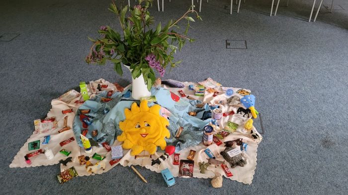Der Freitagabend startete mit einer Begrüßungsrunde. Dazu suchten sich alle Frauen einen Gegenstand, aus der vorbereiteten Mitte, aus und erzählten, was dieser mit ihnen zu tun hat. So kamen wir gut ins Gespräch. Auch über die Erwartungen an das Wochenende tauschten wir uns noch aus. | ![]() |
