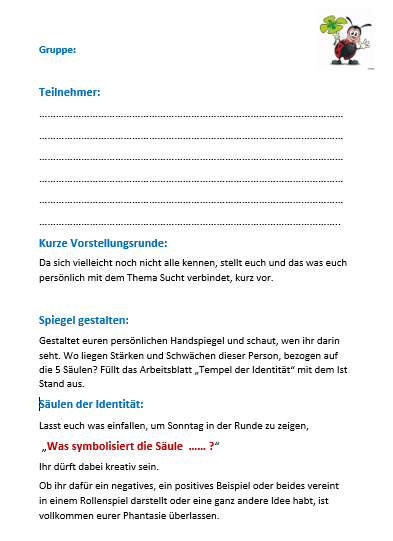 Des weiteren erhielten alle ein Arbeitsblatt zum Tempel der Identität. Dort waren die 5 Säulen der Identität nochmal aufgeführt und in die darunter stehenden Zeilen wurde der momentane Ist Stand eingetragen. Während des darüber Nachdenkens entstanden wertvolle Gedanken und Gespräche. So zum Beispiel über die Werte. Was sind denn meine Werte? Was ist mir dabei wirklich wichtig? Ehrlichkeit, Pünktlichkeit, Hilfsbereitschaft, Treue, Verlässlichkeit sind oft Dinge die wir auch von anderen Voraussetzen und sind enttäuscht, wenn dies nicht so eingehalten wird. Aber eigentlich sind es doch unsere persönlichen Werte. Was, wenn jemand diese nicht mit mir teilt? Hat das Auswirkungen auf die Säule der Beziehung? Sollte ich mich dann zum Beispiel aus einer Freundschaft lösen, weil mir diese so nicht gut tut? Es gab unterschiedlichsten Diskussionsbedarf in den Gruppen. Der 3. Teil der Gruppenarbeit bestand daraus, dass jede Gruppe eine ihr zugeordnete Säule so darstellen sollte, dass alle noch einmal für sich verstehen konnten, um was es bei der Säule geht.
