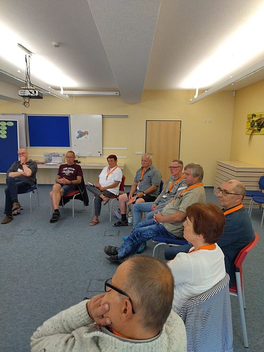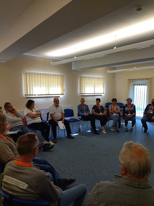 ![]() | Mit der Diskussion zur ersten Frage begannen wir auch gleich den Samstagvormittag. Es standen Fragen „Wie Gruppengründung-wie geht das?“ Öffentlichkeitsarbeit oder Teilnehmermotivation zur Besprechung an. Die Zeit verging recht kurzweilig. Nachmittags kam ein heikles Thema zur Sprache. Wie gehe ich mit Menschen in meiner Gruppe um, die mich und die Gruppe belügen? Wo sind meine Grenzen der Hilfe?Wo sind die Grenzen des Freundeskreises? Trotz der der erwarteten unterschiedlichen Meinungen, kamen alle zu dem Schluss, dass wir ja schließlich selbst krank sind und unsere Grenzen hier nicht überschreiten sollten. Gleichzeitig besteht eine Verantwortung gegenüber der Gruppe. Deren Grenzen sind ebenfalls zu respektieren. Das letzte offizielle Thema des Nachmittags war, Möglichkeiten zu erörtern, eine Gruppe wieder ins Thema zu bringen bzw. auch eine Gruppe wieder interessanter zu gestalten.Auch hier wurde durch die Teilnehmer viele Anregungen gegeben. Der Abend endete mit vielen Gesprächen. |
