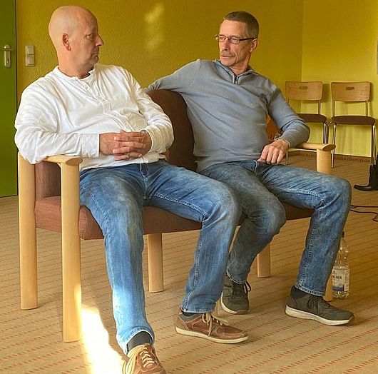 ![]() | Der Samstag begann mit dem Lebensberichten von beiden Referenten. Sie erzählten von Ihren Einstig „nur mal Kosten wie es schmeckt“ über den Gebrauch, den Missbrauch den ersten Kontrollverlusten bis hin zur Abhängigkeit. So berichteten Sie von einer schönen Jugendzeit, aber auch von den Verlust von Elternteilen, den Verlust des Führerscheins und somit der Arbeit. Matthias und Ralph waren beide zu unterschiedlichen Zeiten zur Reha in der SOTERIA-Klinik in Leipzig. Auch über diese Zeit wurde gesprochen. Das diese Zeit nicht spürbar an uns vorbei zog, war an unseren Emotionen zu erkennen. |